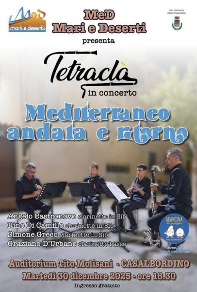 Il concerto, patrocinato del Comune di Casalbordino e inserito nel cartellone natalizio comunale, è ad ingresso gratuito. Sul palco si esibiranno i Tetraclà, un quartetto di clarinetti costituito nel 2019. Il suo repertorio spazia dalla musica classica al pop e al jazz. Esegue sia brani originali che trascrizioni effettuate da un suo componente, nonché promotore del progetto, Angelo Castronovo. Il gruppo è composto da Angelo Castronuovo, Rino Di Camillo e Simone Greco (clarinetti in Sib) e Graziano D’Urbano (clarinetto basso).