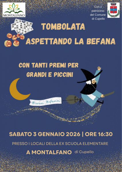 L’Associazione Montalfano Terra Nostra invita tutti a vivere un momento di autentica convivialità con la Tombolata “Aspettando la Befana”, un appuntamento capace di scaldare il cuore e riportare al centro il piacere dello stare insieme.
