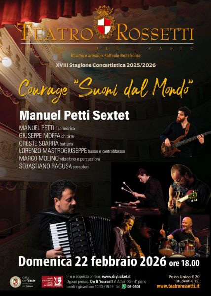 Domenica 22 febbraio 2026, alle ore 18.00, al Teatro Rossetti di Vasto, andrà in scena “Suoni dal mondo” con il Manuel Petti Sextet – Courage, progetto originale guidato dal fisarmonicista e compositore Manuel Petti. Il concerto propone un viaggio sonoro che attraversa musette, tango, samba e swing, in un dialogo continuo tra scrittura e improvvisazione, nel solco della tradizione jazzistica internazionale e della contaminazione world. Il progetto prende il nome dall’album “Courage” (2022), raccolta di composizioni originali che testimoniano la cifra stilistica di Petti: una sintesi tra radici popolari, ricerca timbrica e apertura globale. Sul palco, insieme a Manuel Petti (fisarmonica), si esibiranno Giuseppe Moffa (chitarre), Oreste Sbarra (batteria), Lorenzo Mastrogiuseppe (basso e contrabbasso),Marco Molino (vibrafono e percussioni) e Sebastiano Ragusa (sassofoni).