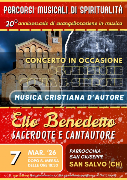 All’interno del programma dell’ostensione della riproduzione della Sacra Sindone, la parrocchia San Giuseppe di San Salvo ospiterà anche un appuntamento artistico di grande valore spirituale: sabato 7 marzo, dopo la Santa Messa delle ore 18:30, si terrà il concerto di Elio Benedetto, sacerdote e cantautore, in occasione del 20° anniversario del suo cammino di evangelizzazione in musica.