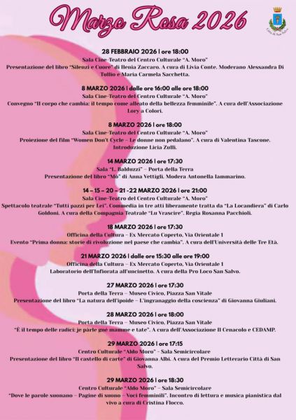 “Il Marzo Rosa è un appuntamento che ogni anno arricchisce la nostra comunità con momenti di cultura, riflessione e condivisione. Ringraziamo tutte le associazioni, le case editrici, gli autori, i relatori e tutti coloro che collaborano fattivamente alla riuscita di questo format. La loro partecipazione dimostra quanto sia viva e dinamica la nostra rete culturale e quanto sia importante continuare a costruire insieme occasioni di incontro e di crescita.”