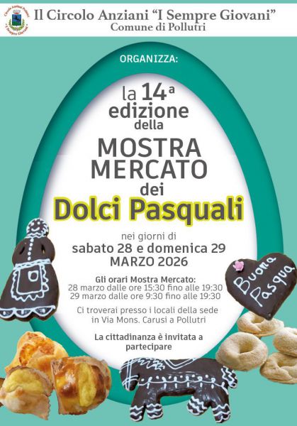Il Centro Anziani "I Sempre Giovani" organizza nei giorni di sabato 28 e domenica 29 marzo la 14° edizione della Mostra Mercato dei Dolci Pasquali.