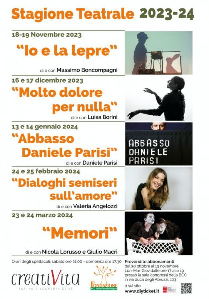 C’è grande fermento in casa creativita, sabato 18 e domenica 19 novembre 2023 partirà il primo dei cinque spettacoli della quarta stagione teatrale targata dall’associazione ! Io e la lepre di e con massimo boncompagni apre le danze! Una stagione brillante e divertente che lascia spazio alle riflessioni più profonde dell’esistenza. Temi come la libertà , l’amore, la solitudine e Dio ma anche la dipendenza, le coincidenze e il giorno del giudizio. Prosa, stand up comedy e avan spettacolo tutto in un unico grandissimo cartellone. Abbonati ormai è tradizione !Info al numero 3892928562.