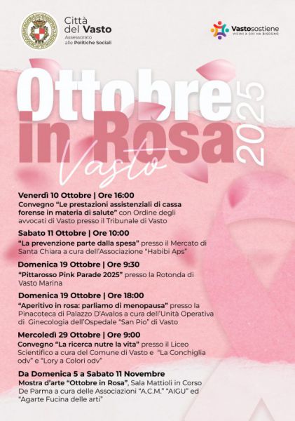 Anche quest’anno Vasto, attraverso l'assessorato alle Politiche sociali, promuove il calendario di iniziative di “Ottobre in Rosa 2025”, un mese dedicato alla prevenzione, alla salute e al benessere femminile.