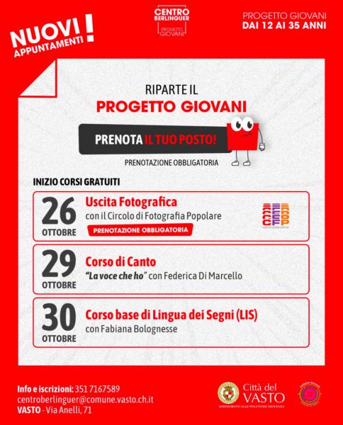 Dal 26 ottobre 2025 prende ufficialmente il via la nuova stagione del Progetto Giovani e del servizio Informagiovani, un programma ricco di attività gratuite dedicate alla formazione, all’espressione creativa e all’aggregazione delle nuove generazioni. Le attività si svolgeranno presso il Centro Berlinguer, in Via Anelli n. 71, e saranno articolate tra corsi, laboratori, eventi culturali e occasioni di incontro per ragazze e ragazzi tra i 12 e i 35 anni. Oltre alle attività programmate, il Centro Berlinguer mette a disposizione una sala prove per gruppi musicali e una sala studio per attività individuali o collettive. Nello specifico, il 26 ottobre si terrà un’uscita fotografica a Furci organizzata dal CFP – Circolo di Fotografia Popolare, un’esperienza immersiva tra arte, natura e storia attraverso una visita guidata nel borgo di Furci con proiezione sulla storia del brigantaggio e percorso naturalistico fino alla suggestiva "Grotta dei Briganti". Il 29 ottobre inizierà il corso di canto "La voce che ho”, a cura di Federica Di Marcello. Un percorso pensato per avvicinarsi al canto attraverso la scoperta della propria vocalità. I partecipanti impareranno a riconoscere, apprezzare e valorizzare il proprio suono, superando i pregiudizi legati al "mestiere del cantante". Il corso prevede anche l’ascolto guidato di voci significative del panorama musicale italiano e internazionale. Il 30 ottobre inizierà il corso base di Lingua dei Segni Italiana (LIS) a cura di Fabiana Bolognese. Un’introduzione pratica e culturale alla LIS per apprendere segni familiari, espressioni basilari e avvicinarsi al mondo della sordità, ricco di storia, valori e significati.
