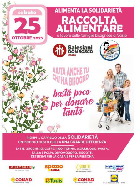 Sabato 25 Ottobre 2025 torna il secondo appuntamento annuale con la Raccolta Alimentare organizzata dalla Parrocchia San Giovanni Bosco di Vasto a favore di tante famiglie bisognose del territorio. Per questa iniziativa si alterneranno insieme i vari volontari della comunità salesiana coordinati dal gruppo interparrocchiale della Diaconia che dal 2010 si prodiga donando pacchi alimentari alle famiglie meno abbienti, offrendo anche servizio di microcredito con pagamento bollette utenze ai nuclei in difficoltà. Sono otto quest'anno i punti vendita della città dove per tutta la giornata saranno presenti i gruppi associativi per raccogliere alimenti e prodotti di prima necessità che verranno poi immagazzinati, stoccati e distribuiti alle famiglie in stato di bisogno e consegnati direttamente presso la Parrocchia San Giovanni Bosco.