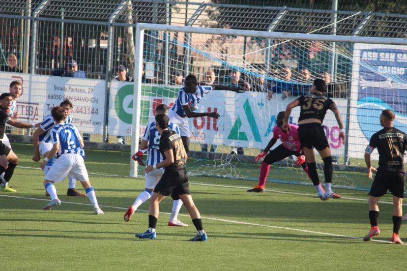 Primo sussulto della gara al tredicesimo con un tiro dai 25 metri di Gagliano che il portiere alza sopra la traversa. Passano 120 secondi, grande accelerazione di Di Ruocco sulla sinistra che in velocità si beve due avversari ma il cross per l’accorrente Ricciardi viene deviato in angolo dai difensori pescaresi. Al ventesimo ancora San Salvo pericoloso botta di sinistro dai 20 metri di Jelicanin il portiere si distende e si salva in angolo. Prima azione ospite al 29’ ma la conclusione di Luca Del Moro è debole e Lanziani blocca facilmente. Al 40’ occasione ghiotta per gli ospiti con Ortigao che da ottima posizione spara incredibilmente alto. Al quarto della ripresa il San Salvo passa in vantaggio: azione sulla sinistra di Di Ruocco il suo cross viene respinto e finisce sui piedi del baby Traino che di sinistro batte l’estremo difensore ospite non esente da colpe nell’occasione. La Folgore Delfino si rende pericolosa al 61’ con Andrea Del Moro che direttamente da calcio d’angolo scheggia la traversa. Si rivede il San Salvo in avanti all’81’ con una conclusione dalla distanza di Squadrone bloccata in due tempi da Beye. Brivido a tre minuti dal novantesimo per il San Salvo, cross dalla sinistra per il neo entrato Prestes che colpisce di testa e la sfera fa la barba al palo e termina sul fondo.