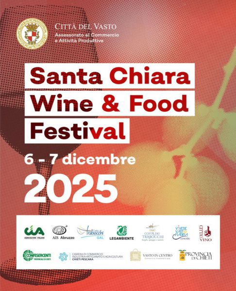 Il centro storico di Vasto si prepara ad accogliere una nuova edizione del Santa Chiara Wine Festival, l’appuntamento dedicato alla valorizzazione del patrimonio enologico e gastronomico del territorio, in programma sabato 6 e domenica 7 dicembre dalle 17:00 alle 24:00presso il Mercato Santa Chiara.