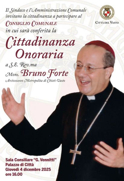 Il 4 dicembre 2025, alle ore 16.00, l’Aula consiliare del Comune di Vasto ospiterà la cerimonia di conferimento della Cittadinanza Onoraria a S.E. Rev.ma Mons. Bruno Forte, Arcivescovo Metropolita di Chieti-Vasto.