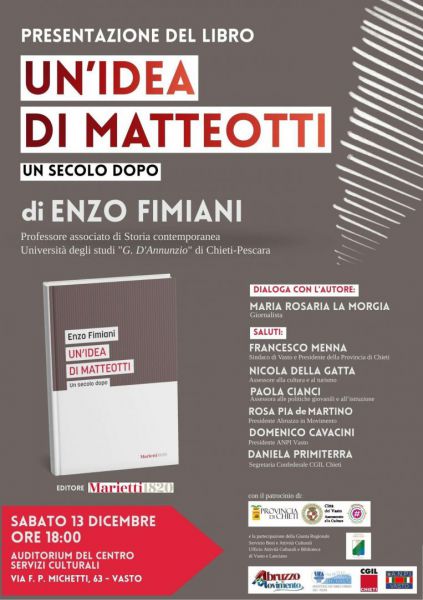 Il Comitato Abruzzo in Movimento, ANPI Vasto e CGIL CHIETI hanno organizzato la presentazione del volume “Un’idea di Matteotti: un secolo dopo.” (Marietti1820 Editore) del Prof. Enzo Fimiani, Professore associato di Storia contemporanea presso l’Università “G. D’Annunzio” di Chieti-Pescara.
