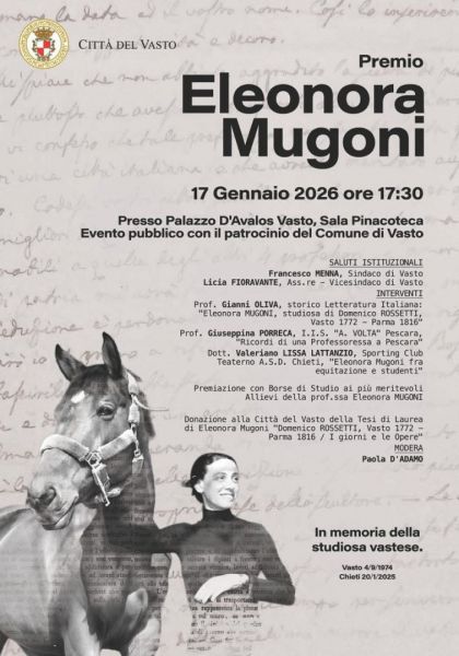 «Con il Premio Eleonora Mugoni, vogliamo ricordare sottolinea il Vicesindaco Licia Fioravante – una ragazza dall’animo mite, una studiosa, un’amante della natura, un’appassionata di equitazione, una donna elegante e raffinata nel cuore e nella mente. Attraverso la vicinanza della sua straordinaria famiglia e dell’adorata sorella Isabella abbiamo potuto ispirare l’evento ad un valore prezioso: la generosità. La tesi su Domenico Rossetti verrà donata alla Città, per far parte del patrimonio culturale di Vasto, e questo ci rende molto orgogliosi e fieri. Eleonora lascia un segno nella nostra comunità che si rinnoverà ogni qualvolta un appassionato, un lettore, un ragazzo si accingerà a sfogliare le pagine di questa preziosa pubblicazione. Ringrazio di cuore a la famiglia Mugoni, che in questi mesi è stata per me un grande esempio di dignità, fede e resilienza, e con loro gioisco per questo importante ricordo, fissato al 17 gennaio giorno in cui è venuta a mancare, ma anche il giorno in cui tanto di lei rivivrà».