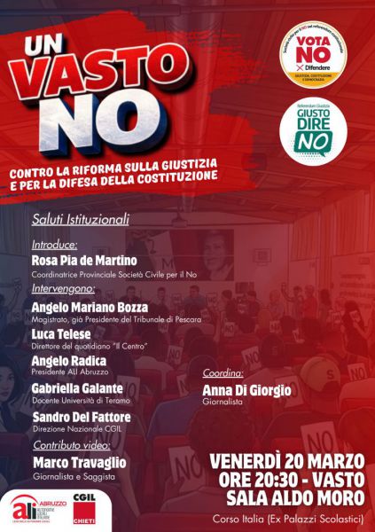 Venerdì 20 marzo 2026, alle ore 20:30, la Sala Aldo Moro di Vasto ospiterà l’incontro pubblico conclusivo della campagna referendaria dal titolo “UN VASTO NO nel Referendum Giustizia”. L’iniziativa è promossa dal Comitato Società Civile per il NO e dal Comitato Giusto Dire NO, con l’obiettivo di offrire un’ulteriore occasione di approfondimento e confronto a ridosso dell’appuntamento con le urne.