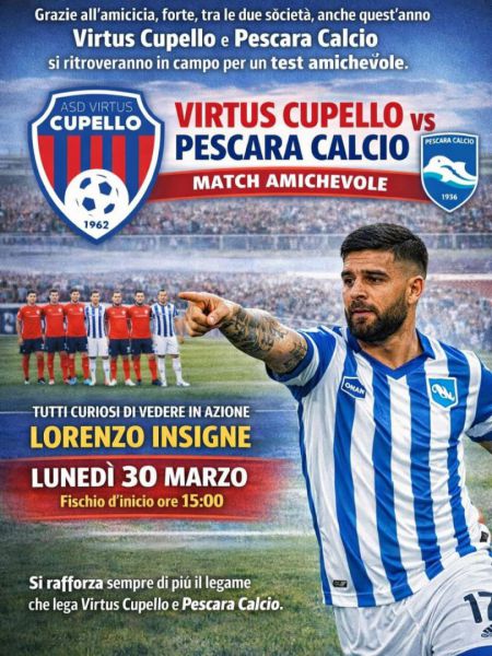Appuntamento da non perdere per gli amanti del calcio quello in programma lunedì 30 marzo a Cupello dopo i rossoblù di casa, allenati da mister Giuseppe Di Francesco, sfideranno in amichevole il Pescara.