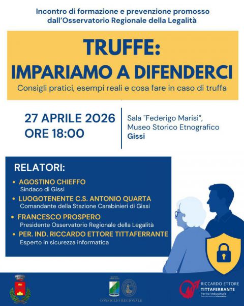 L’Osservatorio Regionale della Legalità prosegue con una serie di incontri di formazione e prevenzione sul tema delle truffe, con l’obiettivo di informare e proteggere i cittadini, in particolare le fasce più fragili della popolazione.