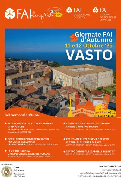 La Delegazione FAI di Vasto, in occasione del 50° anniversario della Fondazione, ha scelto Vasto quale protagonista delle Giornate FAI d’Autunno, proponendo al grande pubblico sei magnifici percorsi culturali, tutti nel centro storico.