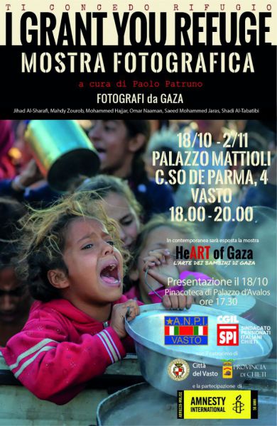 La presentazione della mostra è fissata per sabato 18 ottobre alleore 17:30 presso la Pinacoteca di Palazzo d’Avalos. Dopo i saluti di: Francesco Menna, Sindaco di Vasto, Nicola Della Gatta, Assessore alla Cultura, Domenico Cavacini, Presidente dell'ANPIdi Vasto, Maurizio Di Martino, segretario provinciale dello SPI CGIL di Chieti, si entrerà nel vivo con l’intervento di Shadi Al-Tabatibi, uno degli autori delle fotografie in mostra, e di Renata De Rugeriis Juarez, attivista di Amnesty International che parlerà di “Diritti umani in Palestina: le decisioni della Corte Penale Internazionale”.