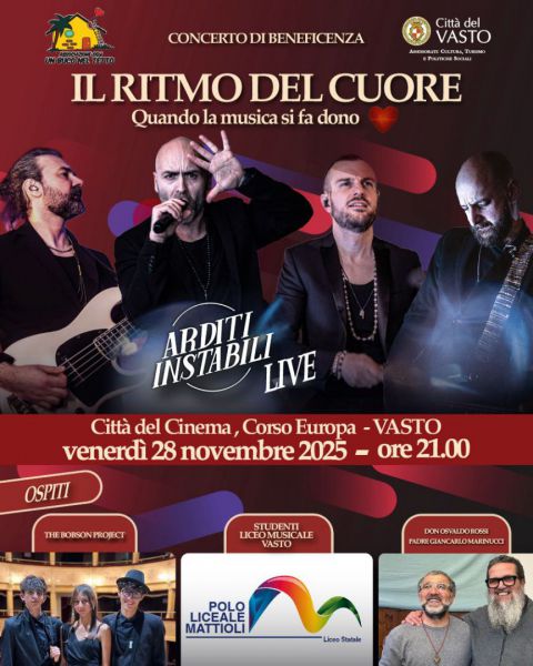 Venerdì 28 Novembre 2025 alle ore 21,00 presso Città del Cinema (ex Multisala del Corso), sita in Corso Europa a Vasto, si terrà un concerto di beneficenza intitolato “Il Ritmo Del Cuore. Quando la musica si fadono”. L’evento, organizzato dall’associazione di volontariato Un buco nel tetto con il Patrocinio del Comune di Vasto (Assessorati alla Cultura, Turismo e Politiche Sociali), ha come obiettivo quello di raccogliere fondi per Casa Betania, una casa di accoglienza sita in San Giovanni Lipioni (CH) fondata da Padre Giancarlo Marinuccie Don Osvaldo Rossi. Entrambi i sacerdoti, molto amati in città, saranno presenti la sera dell’evento e parleranno alla platea del progetto di questa struttura già esistente che necessita di ampliamenti.