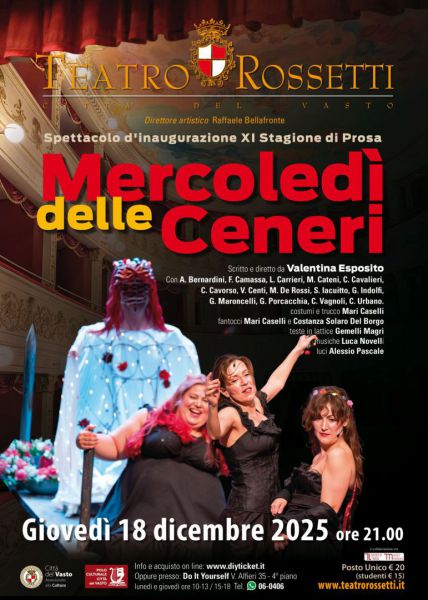 Tutto pronto per l’apertura della stagione di prosa del Teatro Rossetti di Vasto con lo spettacolo “Mercoledì delle ceneri”, in programma giovedì 18 dicembre 2025 alle ore 21:00. Scritto e diretto da Valentina Esposito, lo spettacolo è prodotto dalla Compagnia Fort Apache Cinema Teatro, unica compagnia teatrale stabile in Italia ed Europa composta da attori ex detenuti oggi professionisti del palcoscenico e del cinema. “Mercoledì delle ceneri” affronta con forza e profondità il tema della violenza popolare e delle dinamiche sociali che si ripetono ciclicamente all’interno delle comunità, utilizzando il Carnevale come potente metafora narrativa.
