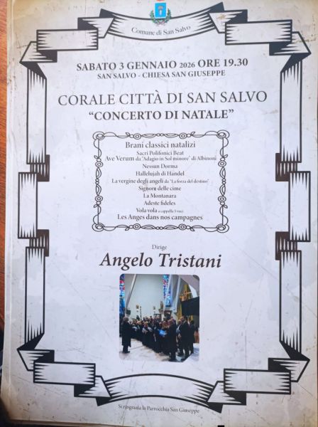 Oggi, sabato 3 gennaio, alle ore 19.30 nella chiesa di San Giuseppe la Corale Città di San Salvo presenta il suo attesissimo “Concerto di Natale”, un viaggio tra capolavori senza tempo e suggestioni spirituali che scaldano il cuore e l’anima. L'evento è patrocinato dal Comune di San Salvo.