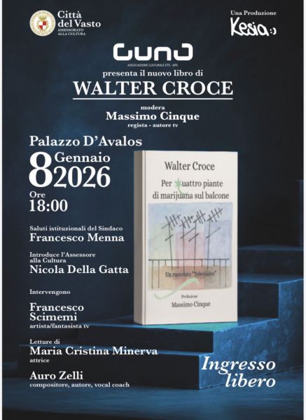 Giovedì 8 gennaio 2026, alle ore 18:00, Palazzo D'Avalos a Vasto ospiterà la presentazione del volume «Per quattro piante di marijuana sul balcone. Un racconto televisivo» di Walter Croce, con prefazione di Massimo Cinque.