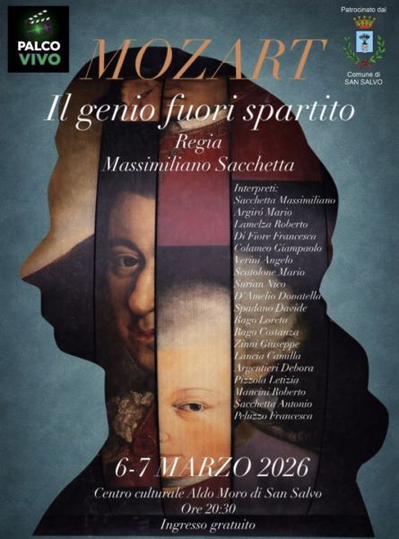 Sarà Wolfgang Amadeus Mozart il protagonista del primo appuntamento teatrale firmato dall’associazione Palco Vivo, che porterà in scena, il 6 e 7 marzo, lo spettacolo “Mozart – Il genio fuori spartito” presso il Centro culturale Aldo Moro di San Salvo.