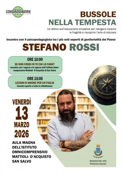 Venerdì 13 marzo 2026 la città di San Salvo ospiterà una giornata di incontri con lo psicopedagogista Stefano Rossi, tra i più noti esperti di genitorialità del Paese, dedicata ai giovani, ai genitori e all’intera comunità educante.