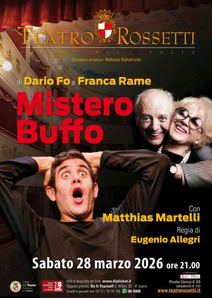 Sabato 28 marzo 2026, alle ore 21:00, sul palco del Teatro Rossetti, andrà in scena lo spettacolo “Mistero Buffo” di Dario Fo e Franca Rame, interpretato da Matthias Martelli e diretto da Eugenio Allegri, produzione del Teatro Stabile di Torino. Considerato il capolavoro di Dario Fo, “Mistero Buffo” rivive attraverso l’interpretazione intensa e coinvolgente di Matthias Martelli, che, solo sul palco e senza artifici scenici, accompagna il pubblico in un viaggio straordinario tra comicità, poesia e riflessione sociale. Uno spettacolo capace di alternare il riso alla denuncia, nel solco della tradizione dei giullari medievali, offrendo uno sguardo critico e attuale sulla realtà. Con oltre 200 repliche in Italia e all’estero, da Roma a Londra, da Milano a Bruxelles, lo spettacolo ha conquistato pubblico e critica, confermandosi come una delle più efficaci riletture contemporanee dell’opera di Fo e Rame.