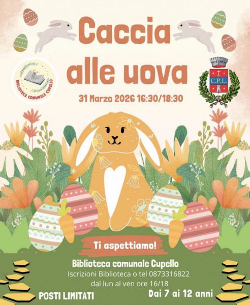 Il Comitato Biblioteca Comunale di Cupello, in collaborazione con l’Amministrazione comunale, organizza un appuntamento dedicato ai più piccoli all’insegna del divertimento e della condivisione: la “Caccia alle uova in biblioteca”, in programma martedì 31 marzo 2026, dalle ore 16:30 alle 18:30, presso la Biblioteca Comunale di Cupello.