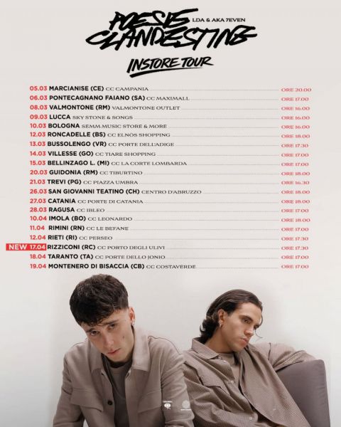Reduci dal Festival di Sanremo 2026 con il brano 'Poesie Clandestine', LDA & Aka 7even annunciano a sorpresa per gli innumerevoli fan l’appuntamento presso il centro commerciale Costaverde di Montenero di Bisaccia. Domenica 19 aprile, a partire dalle ore 17, i due artisti incontreranno i propri fan e firmeranno le copie dell’album Poesie Clandestine pubblicato nelle scorse settimane.