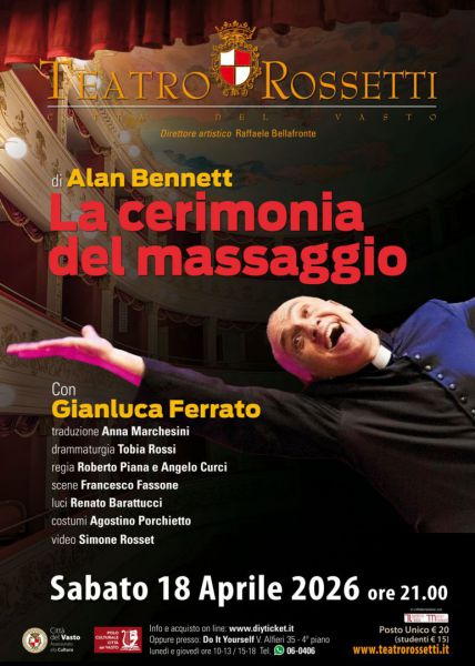 Sabato 18 aprile 2026, alle ore 21:00, al Teatro Rossetti di Vasto andrà in scena “La cerimonia del massaggio” di Alan Bennett, interpretata da Gianluca Ferrato. Lo spettacolo, con la traduzione di Anna Marchesini, la drammaturgia di Tobia Rossi e la regia di Roberto Piana e Angelo Curci, si avvale delle scene di Francesco Fassone, delle luci di Renato Barattucci, dei costumi di Agostino Porchietto e dei video di Simone Rosset. La produzione è firmata da Società per Attori. Al centro della narrazione la figura di Padre Geoffrey Jolliffe, sacerdote alle prese con un delicato equilibrio tra fede e identità personale, chiamato a officiare la commemorazione di Clive, massaggiatore dei vip dal passato ambiguo.