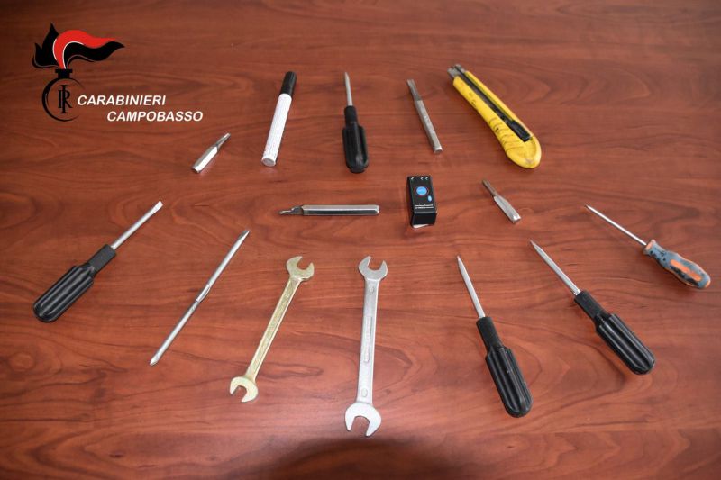 Le ulteriori tempestive indagini consentivano inoltre di rinvenire, parcheggiata su pubblica via di questo centro, l’autovettura utilizzata dai due per giungere in Termoli, all’interno della quale venivano rinvenuti numerosi ulteriori arnesi da scasso ed attrezzi comunque utili per il compimento di furti di veicoli.