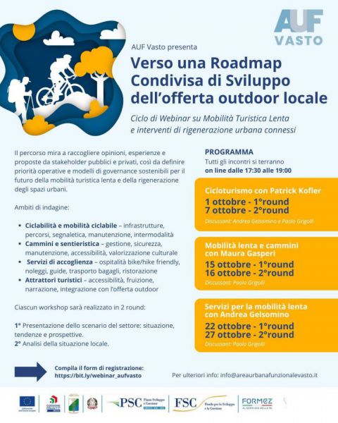Si intitola Verso una Roadmap condivisa di sviluppo dell’offerta outdoor locale, il ciclo di webinar proposto dall’Auf-Area urbana funzionale Vasto. Tema: Mobilità turistica lenta e interventi di rigenerazione urbana connessa, con tre incontri, tutti a ottobre, ognuno con due appuntamenti: si parte oggi, mercoledì primo ottobre alle 17,30.