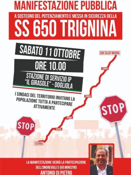 Manifestazione pubblica domani, sabato 11 ottobre, per chiedere il potenziamento e la messa in sicurezza della SS650 Fondo Valle Trigno. L’appuntamento organizzato dai sindaci del territorio, che chiamano a raccolta anche i cittadini, è in programma alle ore 10 presso l‘Area di Servizio Il Girasole a Dogliola.
