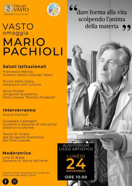 “La nostra comunità cittadina renderà omaggio alla figura di Mario Pachioli nel luogo in cui la sua elevata capacità artistica si è dispiegata durante la sua giovinezza: quell’Istituto d’Arte dove ancora oggi tanti giovani si formano alla cultura della bellezza, con la stessa intensità che Mario profondeva in tutto ciò che realizzava.” Con queste parole il sindaco Francesco Menna, l’assessore alla Cultura Nicola Della Gatta e la Dirigente Scolastica Anna Orsatti hanno annunciato l’evento che avrà luogo lunedì 24 novembre prossimo presso l’Auditorium del Polo Liceale “Pantini-Pudente”.