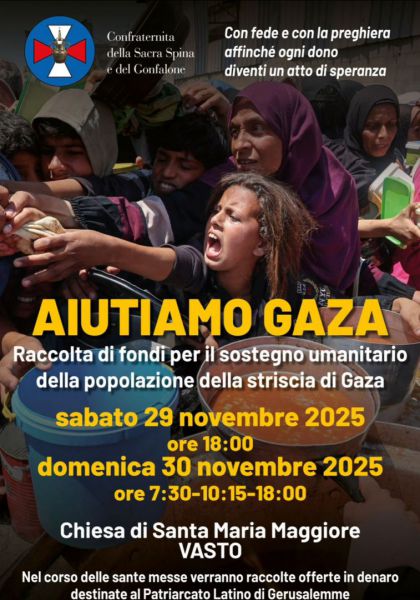 La Confraternita della Sacra Spina e Gonfalone di Vasto organizza sabato 29 e domenica 30 novembre, una raccolta di fondi per la popolazione di Gaza.