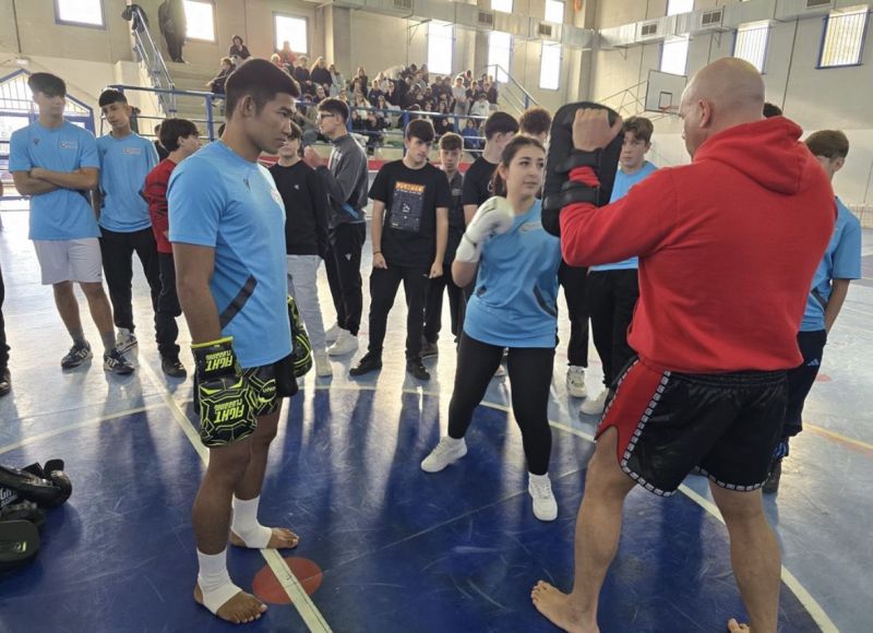 Mattina ricca di emozioni e formazione quella vissuta alcuni giorni fa dagli studenti del primo biennio in Management dello Sport dell’Istituto Tecnico Economico dell’Omnicomprensivo“Mattioli-D’Acquisto” di San Salvo. A far visita agli studenti il campione del mondo di Muay Thai, l thailandese Yodpt Petchrungruang che insieme al maestro della Sparta Group Academy di San Salvo, Giuseppe La Verghetta, ha svolto una lezione pratica partendo dalla fase di “condizionamento fisico globale” sino alla “parte centrale di un allenamento” tipo, con tecniche precise di colpi e parate. L’incontro didattico è stato organizzato dalla docente di scienze motorie e sportive dell’Istituto, Rita Valerio e la Sparta Group Academy che l’atleta sta frequentando in vista dell’imminente evento “Fight Clubbing 40” (che si terrà a San Marino il prossimo 20 dicembre e che rappresenta una delle 5 tappe del campionato mondiale, trasmesso su DAZN in più di 200 nazioni).