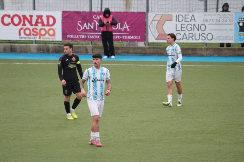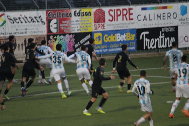 Al 20’ occasione ghiotta per il San Salvo, ripartenza di Ricciardi che si accentra calcia di sinistro e la conclusione deviata dal difensore finisce di poco fuori a portiere battuto. Due minuti dopo ancora San Salvo pericoloso su un cross di Aquilano sul quale l’accorrente Ricciardi viene anticipato all’ultimo momento. Al 24’ il match si sblocca, Squadrone pressa a centrocampo si sbarazza di due avversari e il suo pessimo tiro diventa assist per Jelicanin che stoppa la palla e calcia alle spalle dell’incolpevole portiere ospite. I biancazzurri spingono e al 32’ sfiorano il raddoppio con Ruggieri che sugli sviluppi di un calcio d’angolo da ottima posizione di testa non colpisce bene la sfera. Lo sforzo della squadra di Piccioni porta i suoi frutti al 34’ quando Squadrone in giornata super calcia al volo e firma il raddoppio. A inizio ripresa partono bene gli ovidiani che si rendono pericolosi con un collo esterno di Di Ciocco che chiama Lanziani ad alzare la sfera sopra la traversa. Le due squadre giocano la gara a viso aperto e il sigillo al match arriva a cinque minuti dal novantesimo con una grande azione di Zanette che crossa al centro per il neo entrato Potalivo che senza esitazioni firma il 3-0.