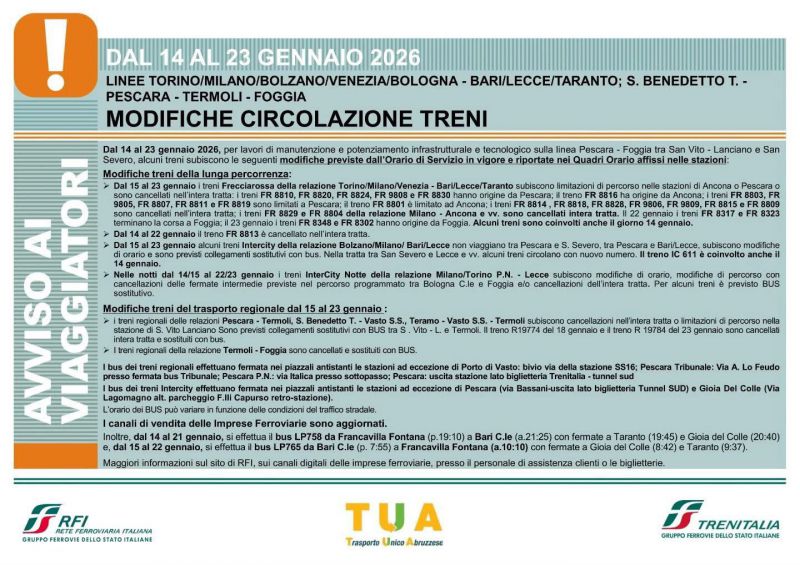 Al via la terza fase degli interventi di potenziamento infrastrutturale e tecnologico fra San Vito Lanciano e San Severo, tra Pescara e Foggia. Rete Ferroviaria Italiana (Gruppo FS) effettuerà i lavori dal 14 al 23 gennaio 2026.