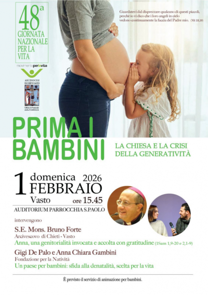 Mettere al centro chi non ha voce, accogliere il mistero del nascere e riscoprire la bellezza di essere comunità "generativa". Con questo spirito, l’Ufficio di Pastorale della Famiglia dell’Arcidiocesi di Chieti-Vasto invita all’evento "Prima i Bambini: La Chiesa e la crisi della generatività", che si terrà domenica 1 febbraio alle ore 15.45 presso l'Auditorium Parrocchia San Paolo di Vasto.