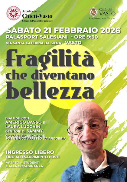Sabato 21 febbraio 2026, alle ore 09:30, presso il Palasport Salesiani di Via Santa Caterina da Siena, si svolgerà l’evento “Fragilità che diventano bellezza”, un incontro dedicato ai giovani vastesi a cui prenderanno parte i genitori del compianto giovane ricercatore scientifico Sammy Basso, Amerigo Basso e Laura Lucchin. L’iniziativa è promossa dall’Ufficio di Pastorale familiare dell’Arcidiocesi di Chieti-Vasto e dall’assessorato alla Cultura del Comune di Vasto. Il biologo Sammy Basso si spense a 28 anni il 5 ottobre 2024. Affetto dalla rarissima progeria di Hutchinson-Gilford, nota come “sindrome da invecchiamento precoce”, ne era il malato più longevo al mondo. E, da anni, ne era testimone e divulgatore, specie in merito alle terapie utili per rallentarne il decorso. Un tema che fu alla base anche della sua tesi di laurea, nel 2018. Il suo contributo e la sua testimonianza sono stati fondamentali per far conoscere al mondo la progeria e per aprire nuovi campi di ricerca contro le malattie genetiche più rare.
