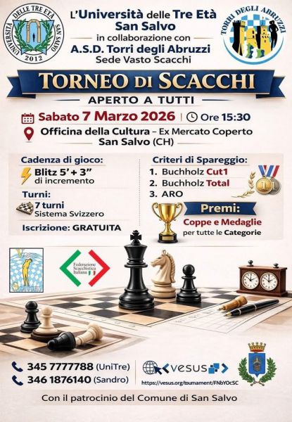 L'Università delle Tre Età di San Salvo è lieta di invitare tutti gli appassionati e curiosi al secondo Torneo di Scacchi, organizzato dall'associazione in collaborazione con l’A.S.D. Torre degli Scacchi e con il patrocinio del Comune di San Salvo.
