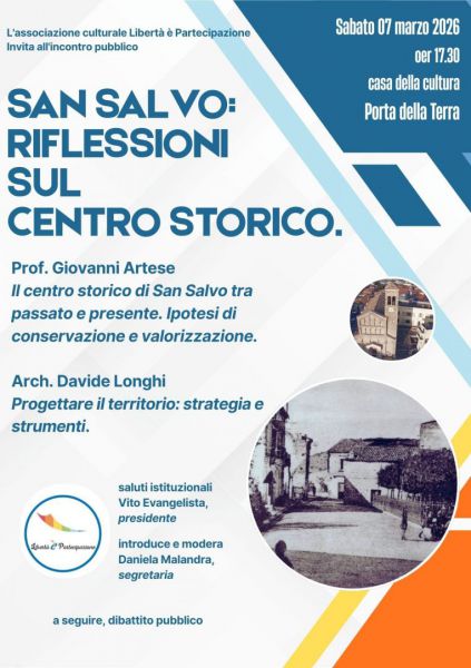 L’associazione Libertà è Partecipazione annuncia l’organizzazione del convegno pubblico dal titolo “San Salvo: riflessioni sul centro storico”, un appuntamento aperto alla cittadinanza dedicato all’analisi, alla valorizzazione e al futuro del cuore storico della città.
