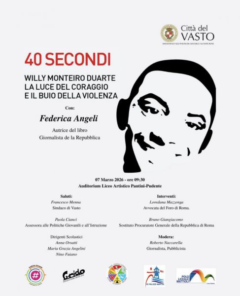 Domani, sabato 7 marzo, alle ore 9.30, presso l’Auditorium del Liceo Artistico “Pantini-Pudente” di Vasto, si terrà l’iniziativa dedicata a Willy Monteiro Duarte, il giovane ucciso a Colleferro nel 2020 in seguito a una violenta e brutale aggressione, promossa dall’assessorato alle Politiche giovanili e all’Istruzione in collaborazione con l’Associazione Grido e gli Istituti secondari di secondo grado della città,