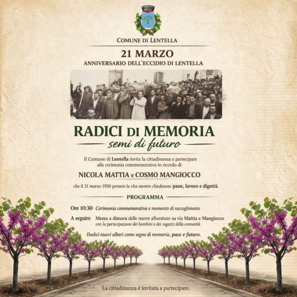 “Nel giorno dell’anniversario dell’Eccidio di Lentella, - fa sapere il comune - renderemo omaggio alla memoria di Nicola Mattia e Cosmo Mangiocco, che nel 1950 persero la vita mentre chiedevano pane, lavoro e dignità. Sarà un momento di raccoglimento e memoria condivisa, ma anche di impegno verso il futuro. Per questo, insieme ai bambini e ai ragazzi della nostra comunità, pianteremo dodici nuovi alberi su via Mattia e Mangiocco: un gesto semplice ma profondamente simbolico, perché le radici della memoria possano diventare semi di futuro. Ricordare significa custodire la storia, trasmettere valori e costruire insieme una comunità più consapevole. La cittadinanza è invitata a partecipare”.