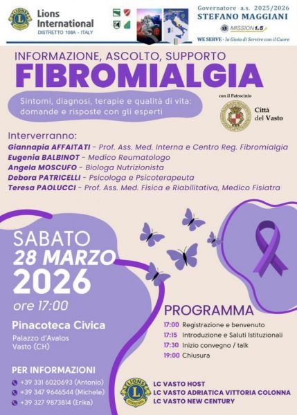La fibromialgia è una sindrome cronica multifattoriale di cui troppo poco si parla e si conosce e il cui approccio terapeutico, invece, richiede un intervento multidisciplinare. Anche per queste ragioni la fibromialgia è stata scelta dai Lions del Distretto 108 A (Romagna, Marche, Abruzzo e Molise) come tema distrettuale per l’anno sociale in corso e per conoscere meglio gli aspetti di questa patologia, di recente inserita nelle sue forme molto severe tra i Livelli Essenziali di Assistenza (LEA), i Lions Club Vasto Host, Vasto Adriatica Vittoria Colonna e Vasto New Century promuovono un evento divulgativo e di confronto nella giornata di sabato 28 marzo, a partire dalle ore 17.00 nella Pinacoteca di Palazzo d’Avalos.
