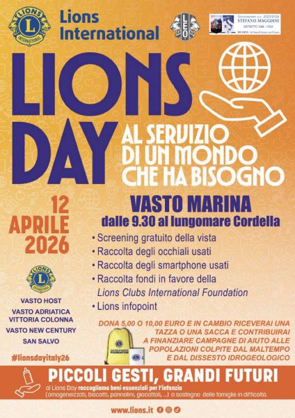 Teatro della manifestazione sarà il parcheggio di lungomare Cordella a Vasto Marina, che, a partire dalle ore 9.30 di domenica 12 aprile, vedrà impegnati i soci Lions dei Club Vasto Host, Vasto Adriatica Vittoria Colonna, Vasto New Century e San Salvo, sodalizi che per l’occasione hanno organizzato uno screening gratuito della capacità visiva e una raccolta di beniessenziali per l’infanzia (pannolini, omogenizzati, pappe, biscotti, giocattoli...). Service principali che saranno affiancati anche dalla raccolta di smartphone in disuso, che verranno scambiati con alberi da piantare nella comunità, e dalla raccolta tradizionale di occhiali usati, da vista e da sole, che verranno recuperati, ripuliti, ricatalogati e distribuiti gratuitamente a chi ne ha bisogno anche in Italia. Non mancherà la possibilità di contribuire ad una raccolta fondi in favore della LCIF-Lions Clubs International Foundation per le campagne di aiuto alle popolazioni colpite da maltempo e dissesto idrogeologico, e tutti sappiamo quanto la tematica sia strettamente attuale. A fronte di una donazione pari a euro 5,00 si riceverà in omaggio di gratitudine consistente in una tazza mug; a fronte di una da almeno 10,00 euro si riceverà una sacca.