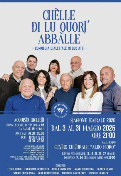 Dopo il successo travolgente delle ultime stagioni, che dal 2023 hanno fatto registrare il "tutto esaurito" a ogni replica, il Gruppo Teatrale "Amici del Sorriso" torna finalmente in scena. Per la stagione 2026, la compagnia sansalvese propone un nuovo appuntamento con la comicità pura: " Chèll di lu quort’ abbàlle ".