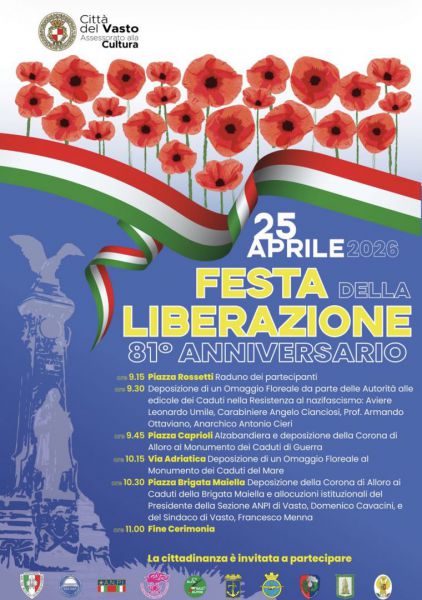 Il 25 aprile 2026, in occasione dell’anniversario della Festa della Liberazione, il programma delle celebrazioni inizierà alle ore 09:15 con il raduno dei partecipanti in Piazza Rossetti. A seguire è prevista la deposizione di un omaggio floreale ai Caduti della Resistenza al nazifascismo. La cerimonia continuerà in Piazza Caprioli, qui si terrà l’alzabandiera e sarà deposta una corona d’alloro al monumento ai Caduti di guerra. Successivamente, in Via Adriatica, è prevista la deposizione di un omaggio floreale al monumento ai Caduti del mare. Al termine, in Piazza Brigata Maiella, dopo la deposizione di una corona d’alloro, sono previsti gli interventi del sindaco di Vasto, Francesco Menna e del presidente dell’ANPI Vasto, Domenico Cavacini. La cittadinanza è invitata a partecipare.